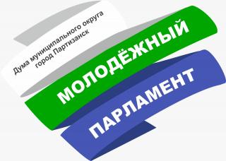 На линиях печатными буквами помещаются слова: на верхней трети - «Дума Партизанского городского округа*» (серебряный или золотой цвет), на средней трети – «МОЛОДЁЖНЫЙ», на нижней трети - «ПАРЛАМЕНТ».